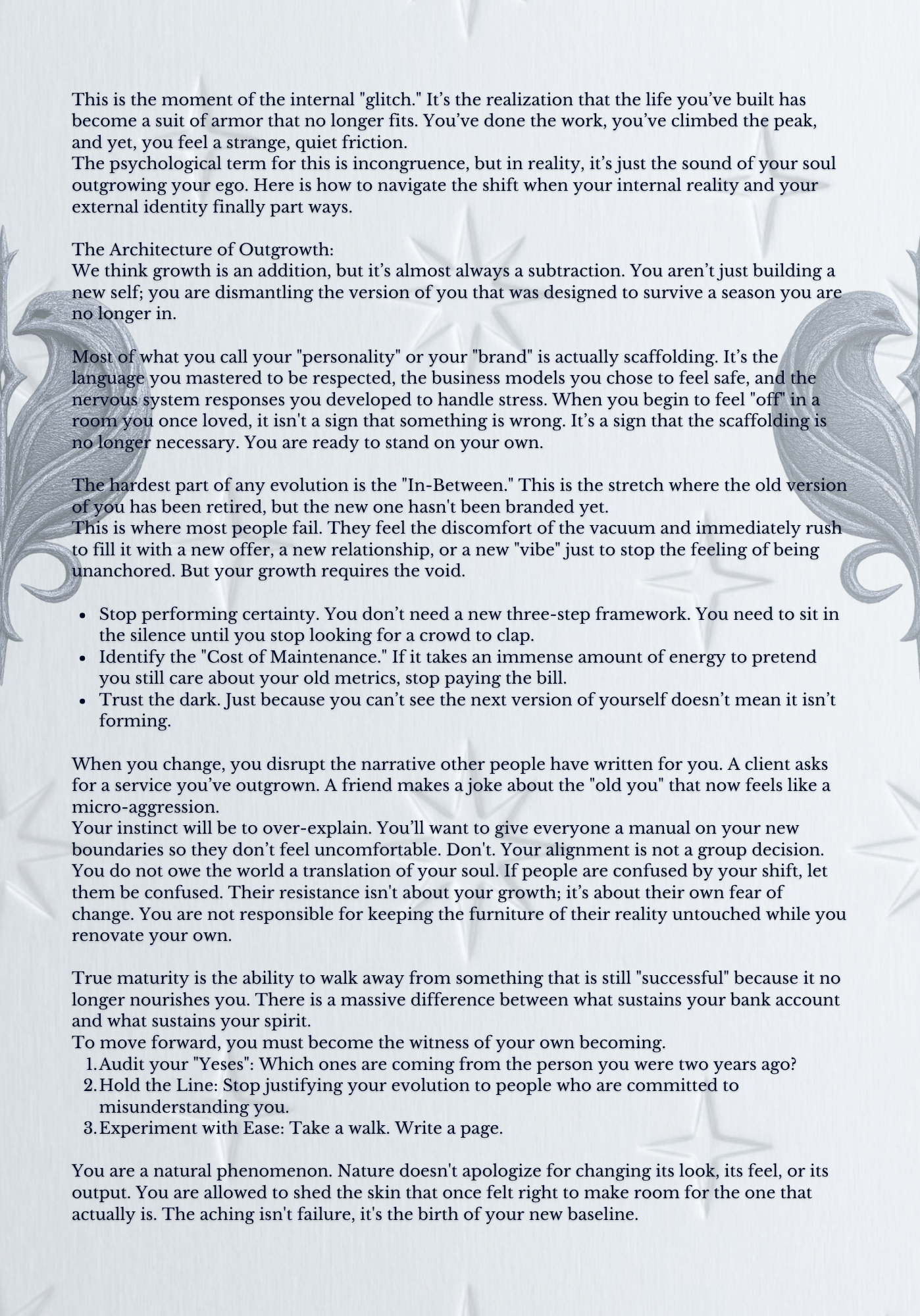 Nature doesn't apologize for changing its look or feel, and neither should you. The aching you feel isn't failure; it is simply the birth of your new baseline.